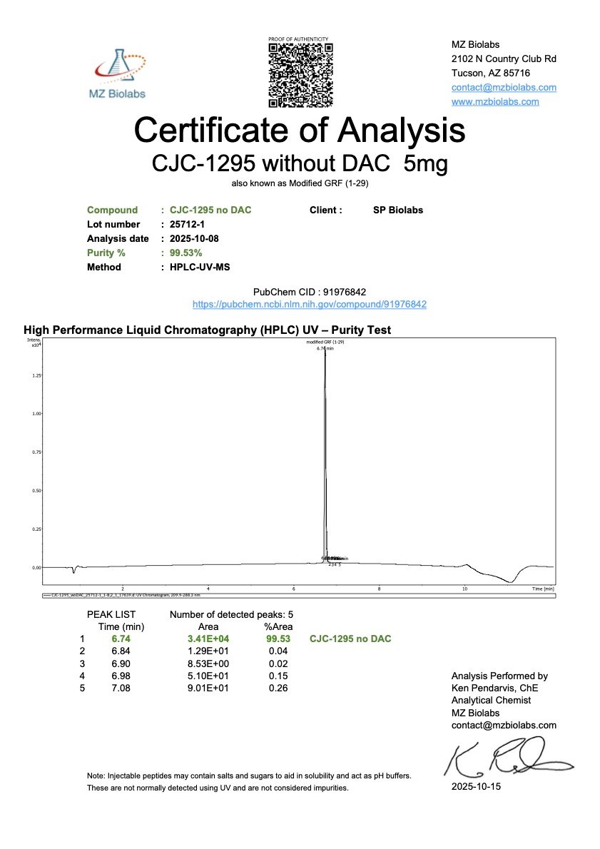 CJC-1295 without DAC, also known as Modified GRF 1-29, is a synthetic analog of growth hormone-releasing hormone (GHRH). This 29-amino acid peptide is designed to stimulate the release of endogenous growth hormone in research models. Lacking the Drug Affinity Complex (DAC), CJC-1295 without DAC has a shorter half-life compared to its DAC-conjugated counterpart, enabling more pulsatile and physiologic GH release in experimental settings. It is commonly studied in combination with GHRP peptides to evaluate synergistic effects on GH secretion pathways.