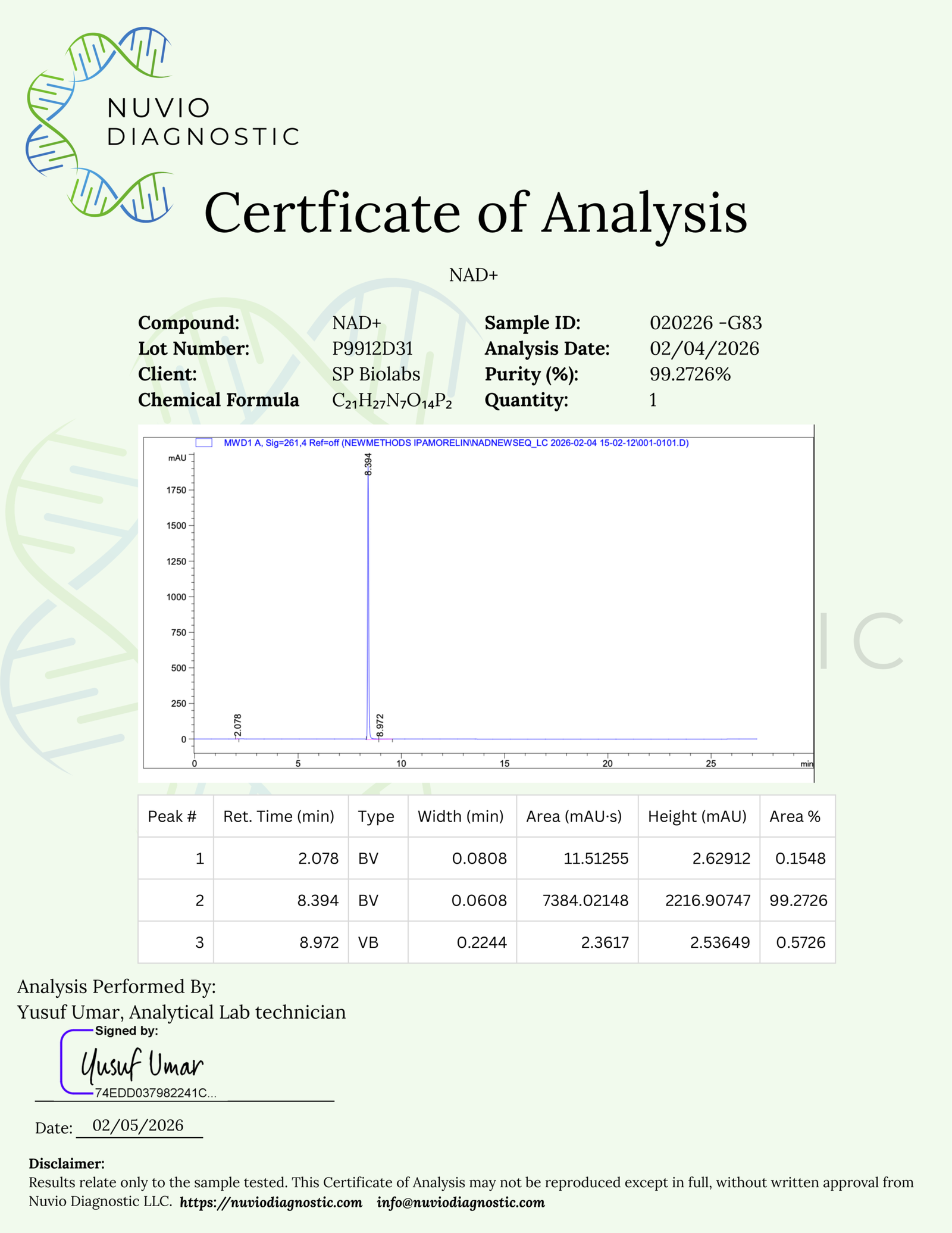 NAD⁺ (Nicotinamide Adenine Dinucleotide) is an essential redox coenzyme present in all living cells and extensively studied for its role in cellular energy metabolism, mitochondrial function, and oxidative stress regulation in laboratory research environments. As a central cofactor in electron transfer reactions, NAD⁺ is critical to ATP production, DNA repair pathways, and sirtuin-mediated signaling cascades.