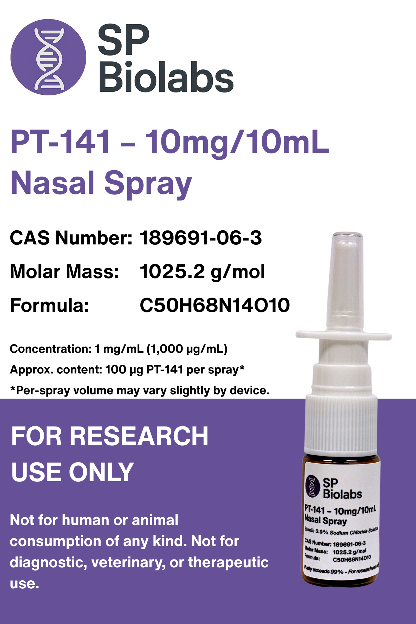 Approximate Content: ~100 µg PT-141 per 0.10 mL spray (typical device output*)