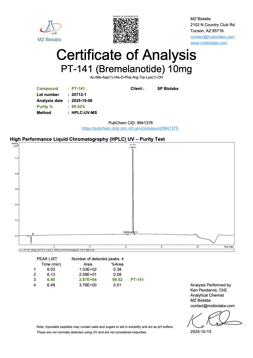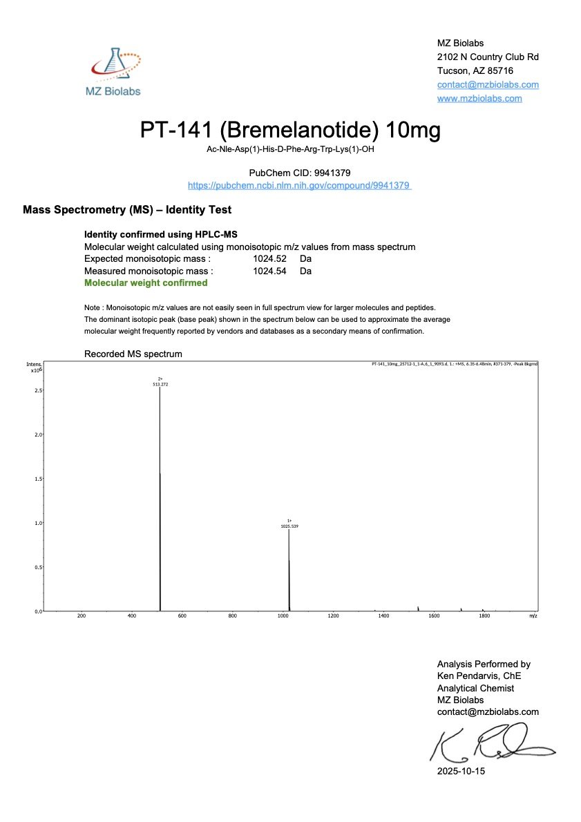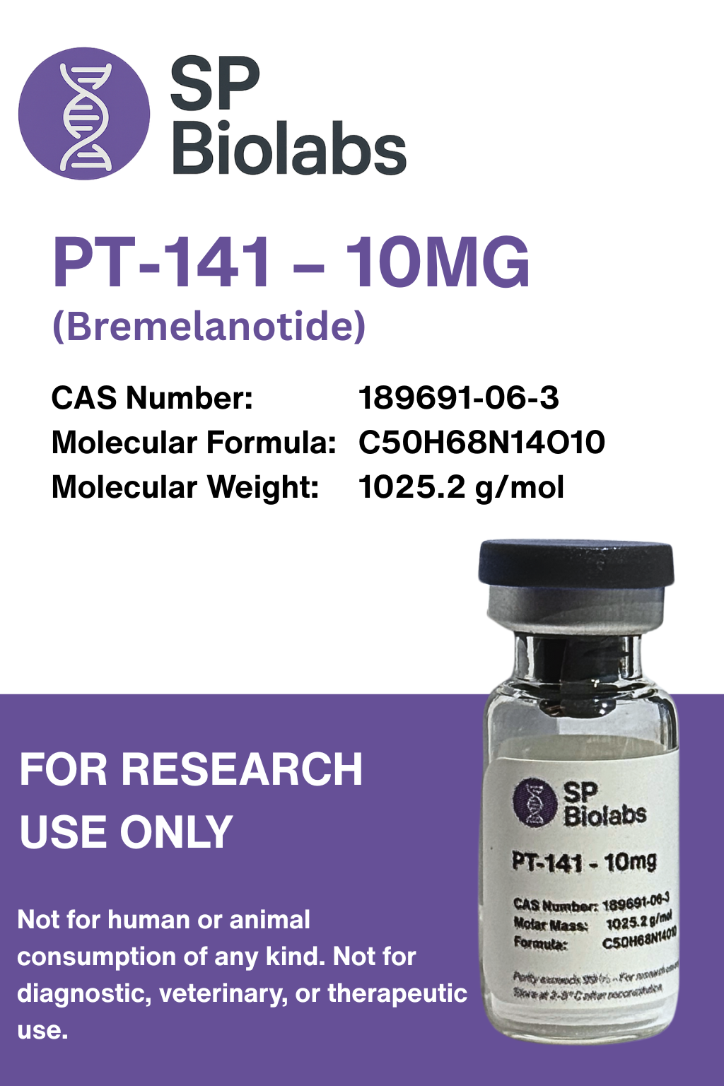 PT-141 (Bremelanotide) is a synthetic peptide analog of α-MSH (alpha-melanocyte-stimulating hormone). Unlike other agents that act on the vascular system, PT-141 primarily targets melanocortin receptors (MC3R and MC4R) in the central nervous system. Researchers have investigated PT-141 for its role in studying neural pathways associated with sexual function, appetite regulation, and energy homeostasis. Preclinical and clinical studies have explored its unique ability to modulate central melanocortin receptors, making it a useful compound in research focused on neuroendocrine signaling and receptor pharmacology.
