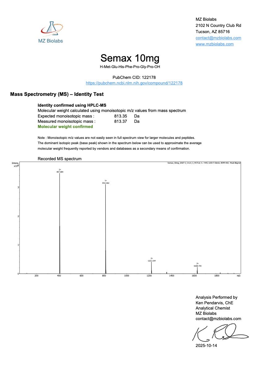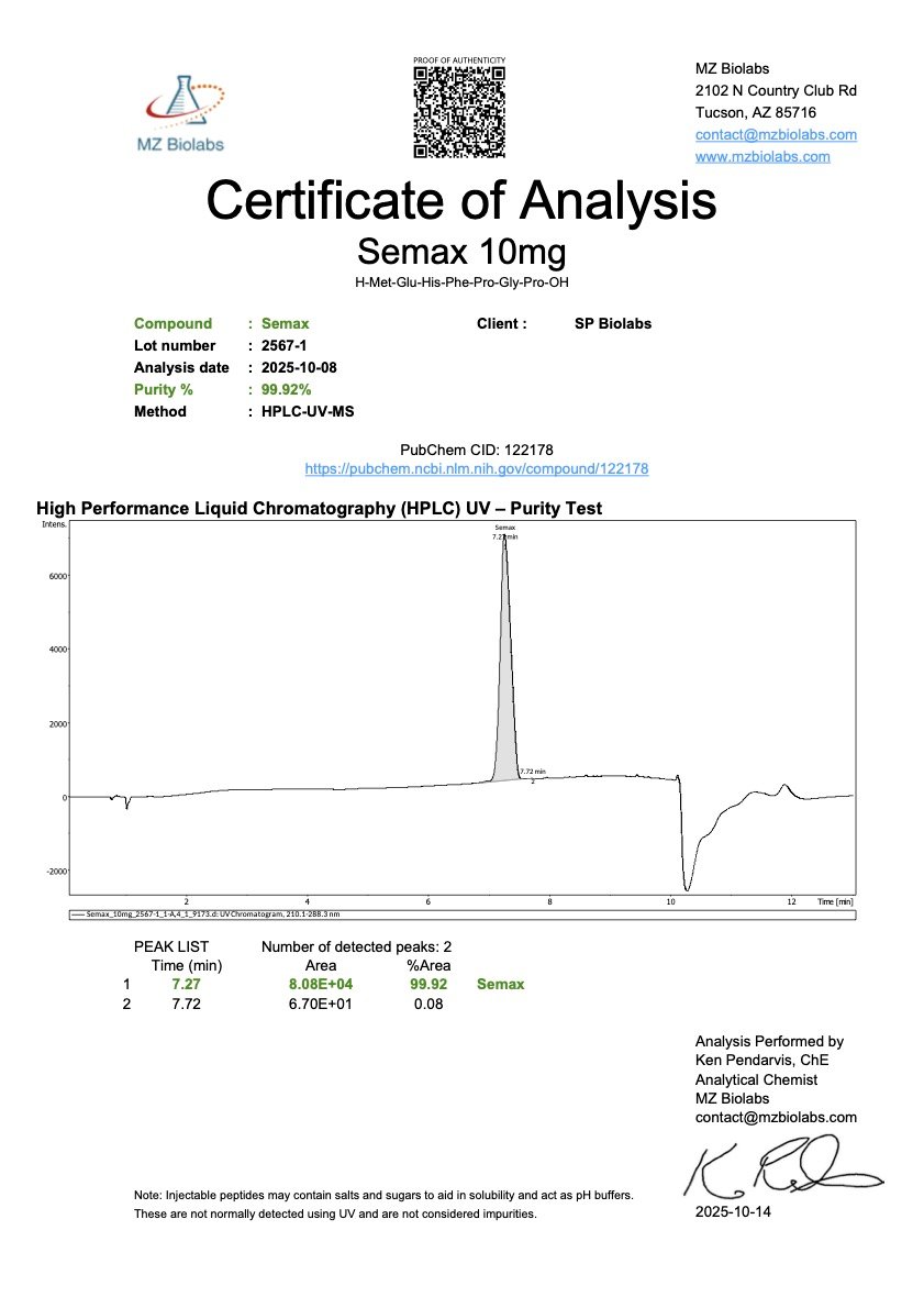 Semax is a synthetic heptapeptide derived from an adrenocorticotropic hormone (ACTH) fragment with the addition of a Pro-Gly-Pro (PGP) sequence to improve stability. It has been studied extensively in research models for its potential neuromodulatory and neuroprotective properties. Semax is often used in preclinical studies investigating memory, learning, and neuroplasticity, as well as in models examining the regulation of neurotransmitter systems and neurotrophic factors.